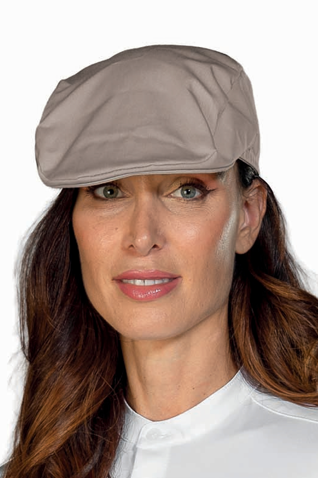 Coppola regolabile tramite velcro e visiera rigida tortora. Per il settore alberghiero e ristorazione. Divisa lavoro per cuoco, bar, pub, ristoranti, negozi alimentari e cucine. Usata in cucina in alternativa alla bustina, alla cuffia o al cappello. Poliestere Cotone. Peso: 195 Gr/m². Composizione: 65% Poliestere 35% Cotone