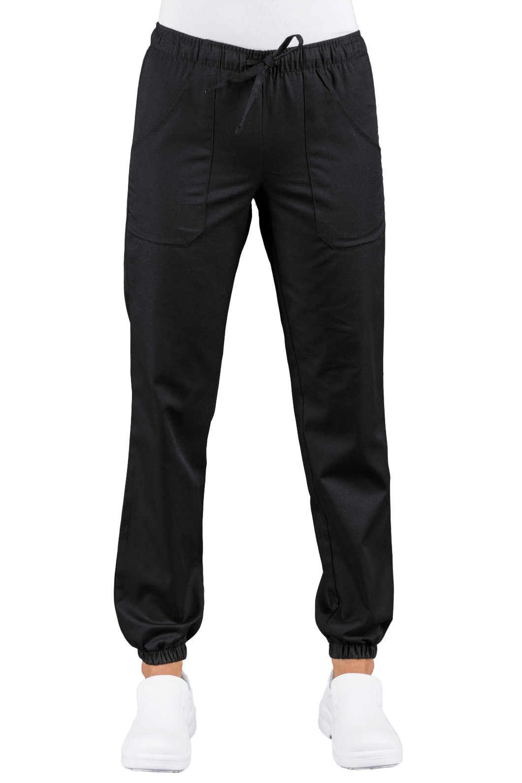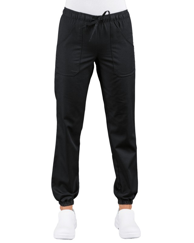 Pantagiaffa unisex con elastico in vita e alle caviglie in tecno stretch nero. Molto utilizzato nel settore medicale, estetico, sanitario, ospedaliero e alimentare. Come divisa da lavoro medico, infermiere, per aziende di servizi, pulizie e cucina e cuoco. In tessuto traspirante e resistente assicura freschezza e comodità per tutta la giornata Poliestere Spandex. Peso: 180 Gr/m². Composizione: 96% Poliestere 4% Spandex