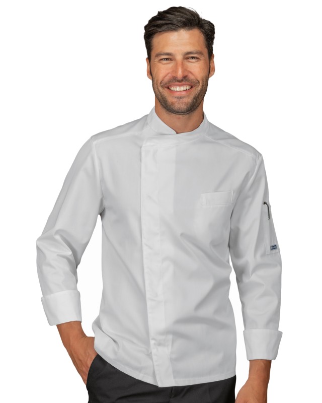 La Giacca da Cuoco Bilbao unisex a manica lunga bianco con tessuto nsostenibile. Ideale come divisa per uomo e donna da chef in cucina, ristorante o catering. Allacciatura asimmetrica con bottoni a pressione. Con taschino sia al petto che alla manica. Lyocell Poliestere Riclicato Manica Lunga. Peso: 180 Gr/m². Composizione: 53% Lyocell 47% Poliestere Riclicato