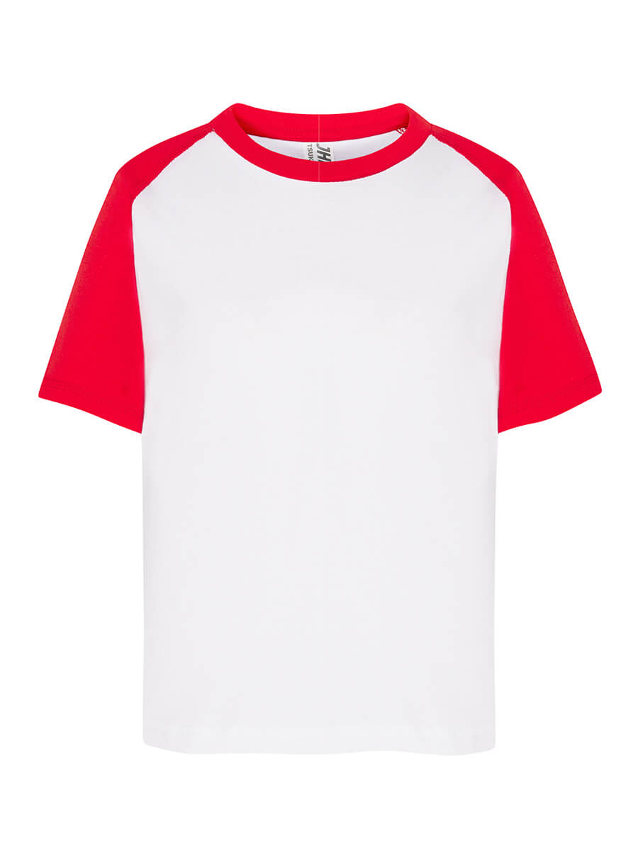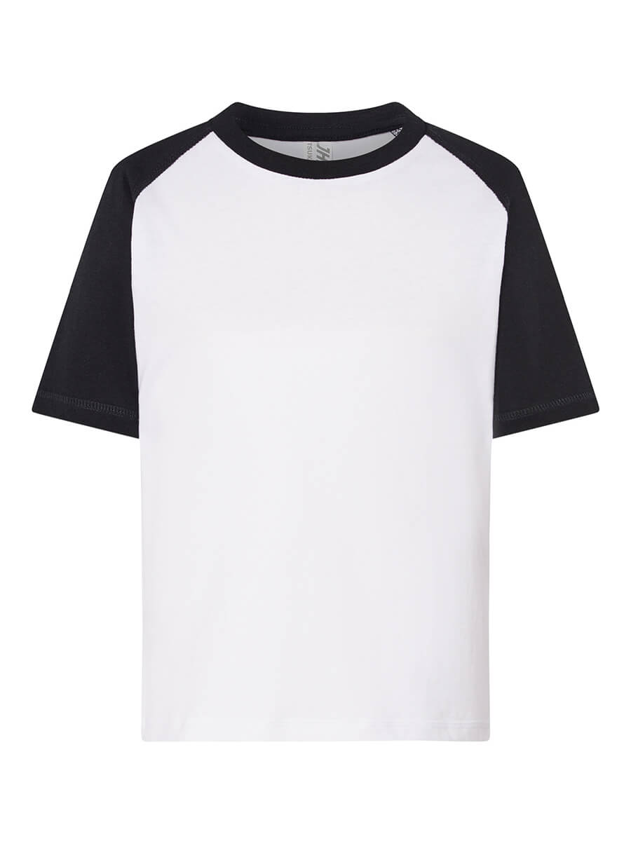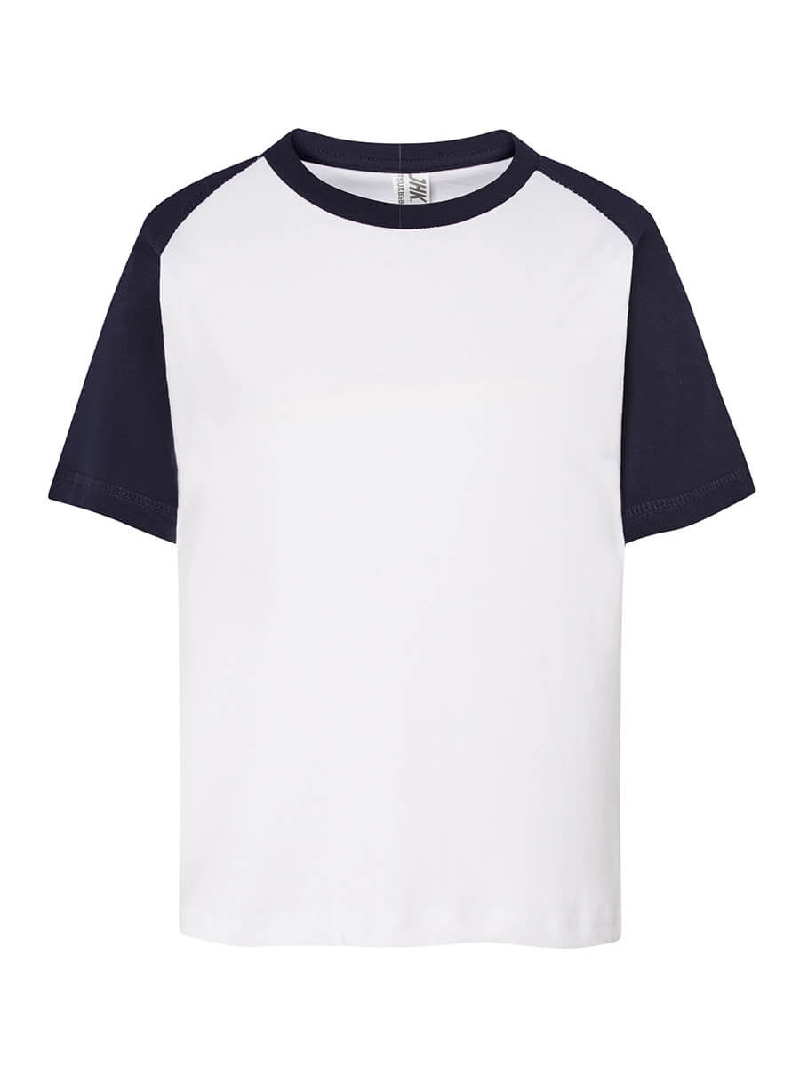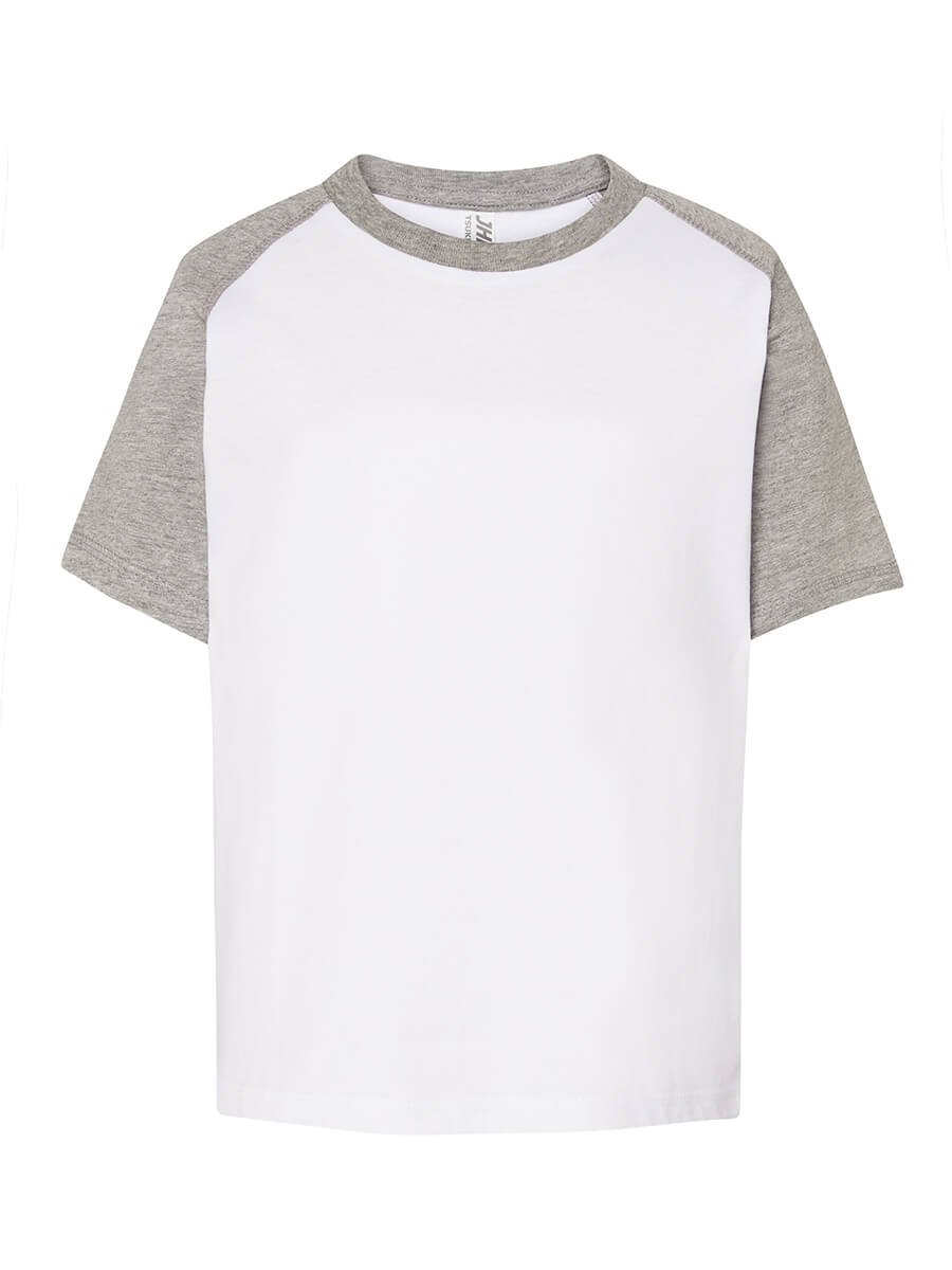 T-Shirt bambino manica corta; Maniche raglan e collo in contrasto; Cuciture laterali; GM - 85% Cotone / 15% Viscosa Composizione: 100% cotone. Peso: 155 gr/m2. Vestibilita: regolare. Busto: cuciture laterali.