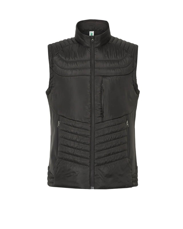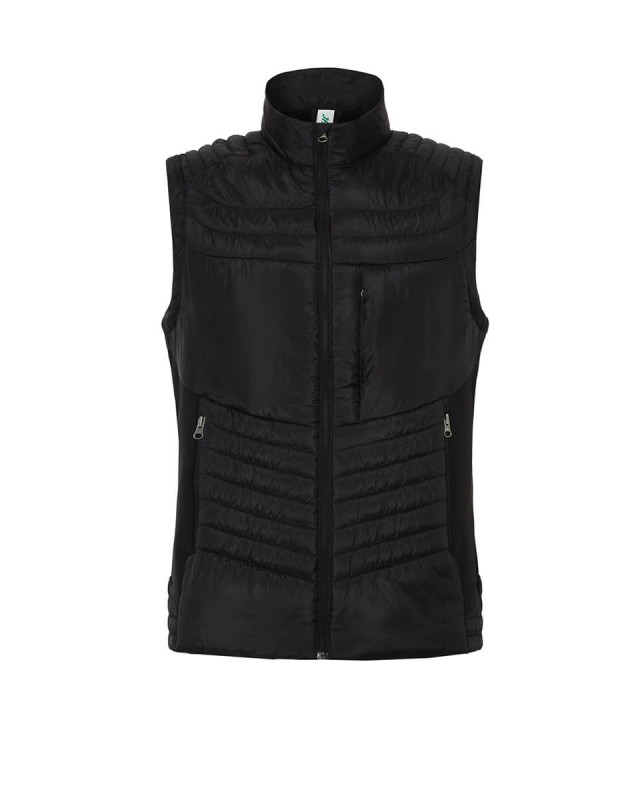 Gilet con cerniera centrale e protezione per il mento in tinta; Interno in tessuto micropile; Parte frontale, spalle e fondo posteriore imbottiti; Pannelli laterali e posteriori in softshell tono su tono; Due tasche laterali e una tasca siul petto con zip; Tasca interna sul lato destro, chiusa con zip; ; ARRIVO PREVISTO GIUGNO Composizione: 94% poliestere riciclato + 6% elastane. Peso: 280 gr/m2. Vestibilita: regolare. Busto: cuciture laterali. Etichetta: rimovibile.
