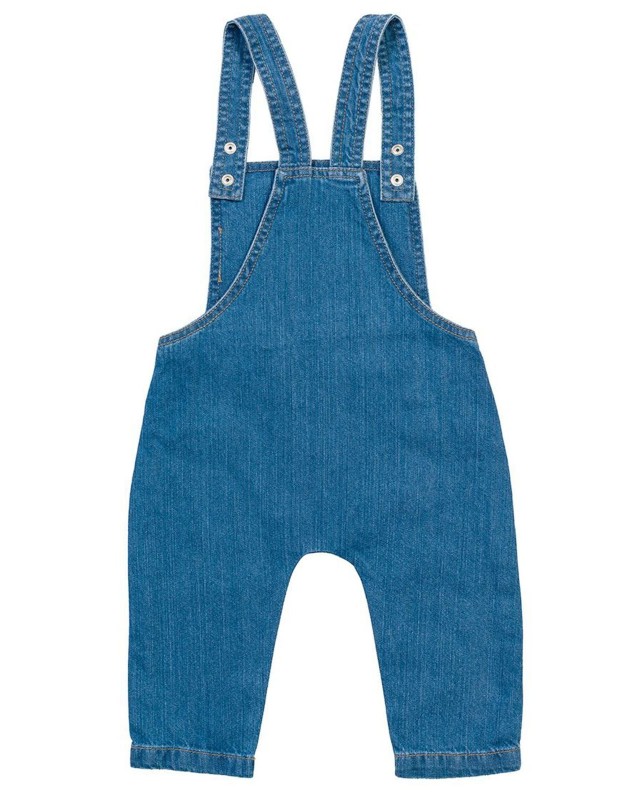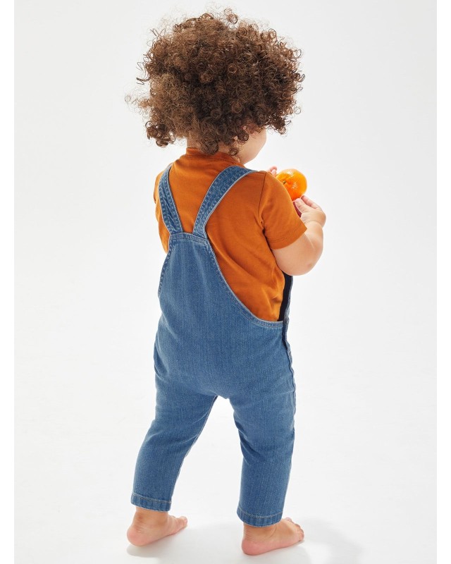 100% cotone organico OCS. Baby salopette in denim con cinturini con bottoni automatici regolabili, nessuna cucitura centrale davanti o dietro per una maggior superficie decorabile, cavallo basso, chiusura con bottoni automatici ai lati, cuciture stile jeans, etichetta a strappo.