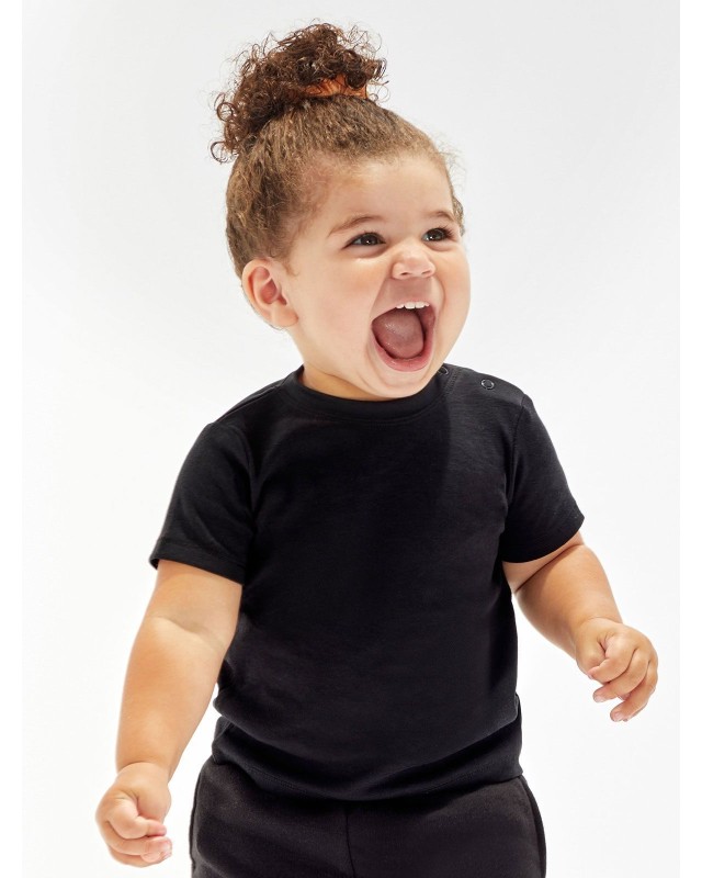 100% cotone (organico o in conversione), single jersey 150 g/m2. T-shirt da neonato con bottoni automatici senza nichel. Cuciture piatte sulle maniche e sull'orlo. Etichetta taglia removibile sul collo. Etichetta con istruzioni di lavaggio in cotone organico.