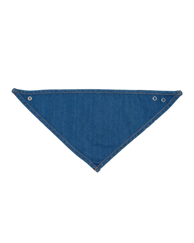 100% cotone organico OCS. Baby bandana in denim con due bottoni a pressione senza nickel, cuciture effetto jeans, etichetta a strappo.