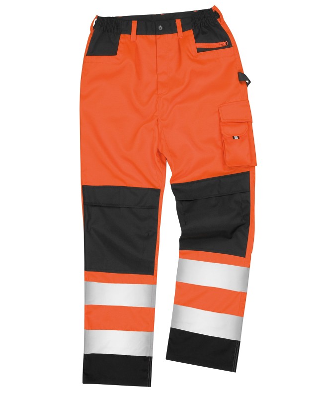 80% poliestere 20% cotone twill. Pantaloni con girovita leggermente elasticizzato con passanti, zip frontale con bottone, tasche posteriori, spacco e zip su tasche frontali, pannelli a contrasto neri, rinforzi sui punti di stress, bande riflettenti sulla gamba, tasca laterale, tasche per ginocchiere. EN ISO 20471:2013 CLASS 2, GO/RT 3279 ISSUE 8:2013 CLASS 2 (arancione).