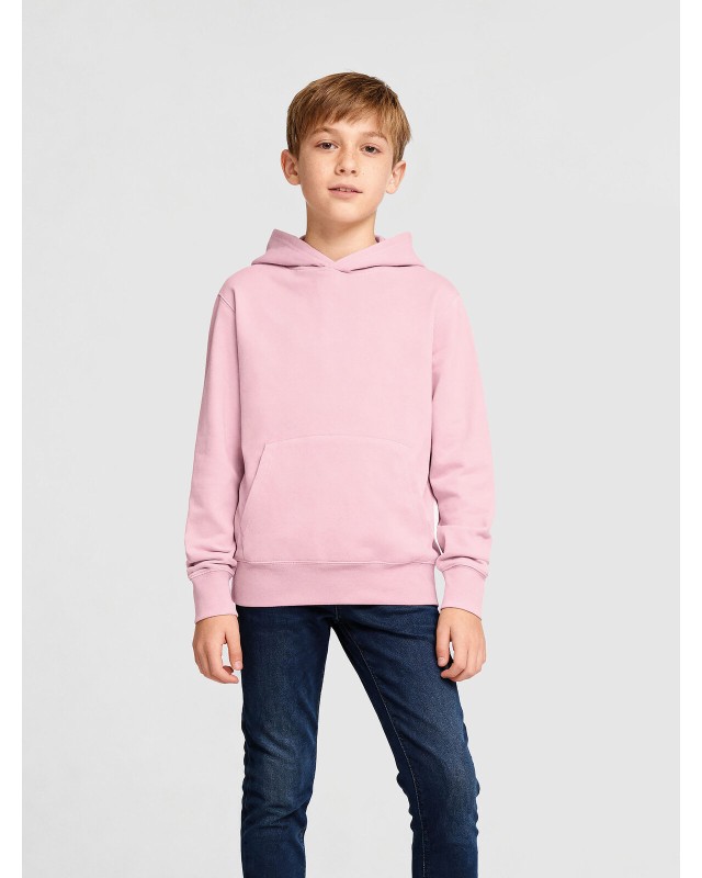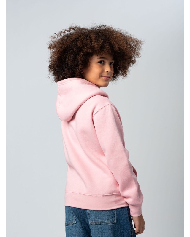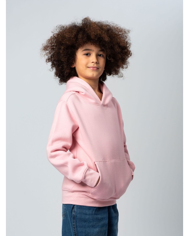 70% cotone pettinato, 30% poliestere. Tessuto PST: interno in poliestere ed esterno 100% cotone. Felpa da bambino con maniche set-in, unisex a tre strati, felpata internamente, cappuccio a doppio strato, grande tasca a marsupio, struttura con cuciture laterali, fascia in vita e polsini in costina. Etichetta strappabile.