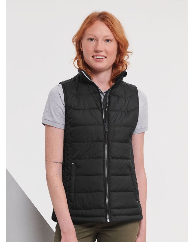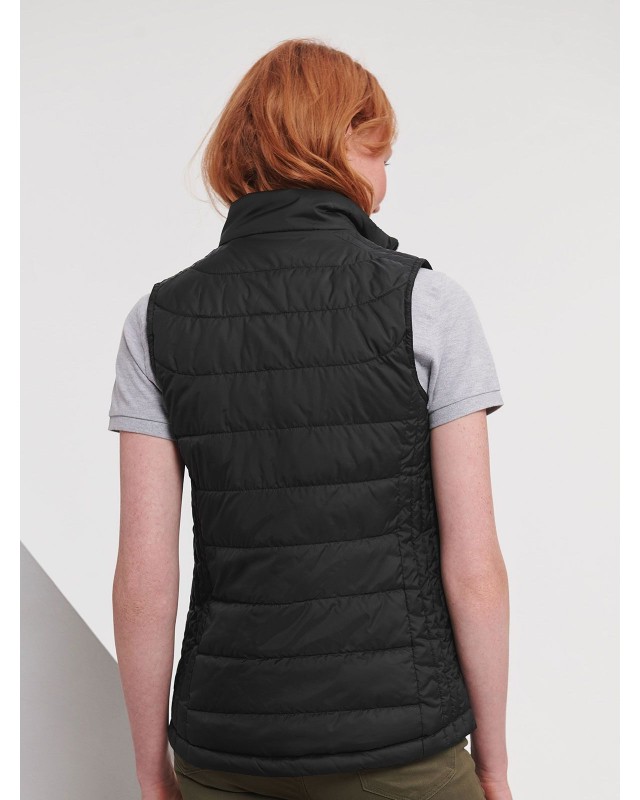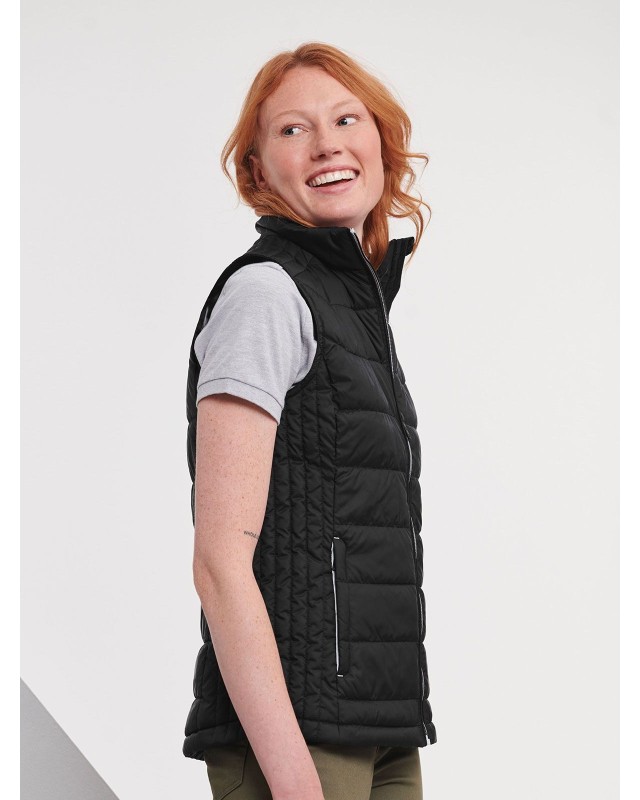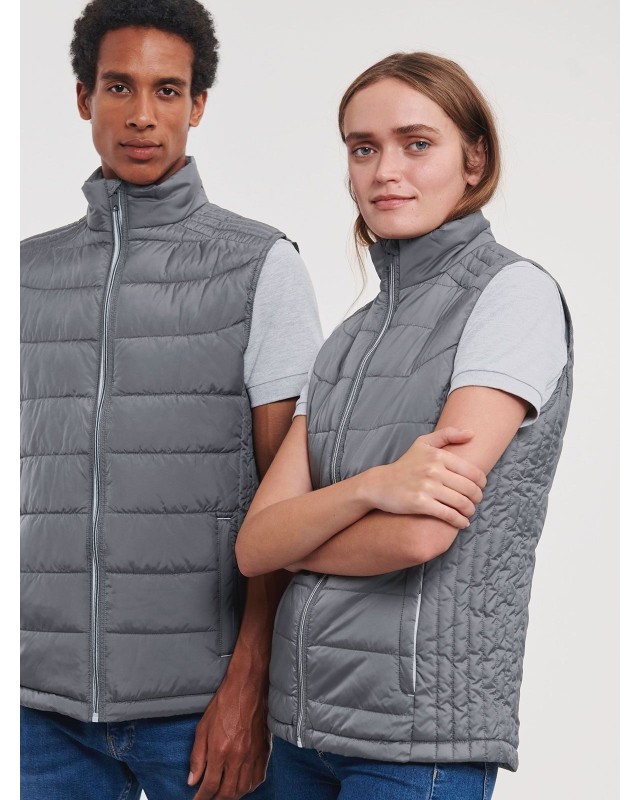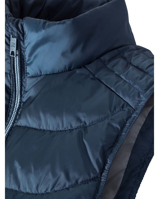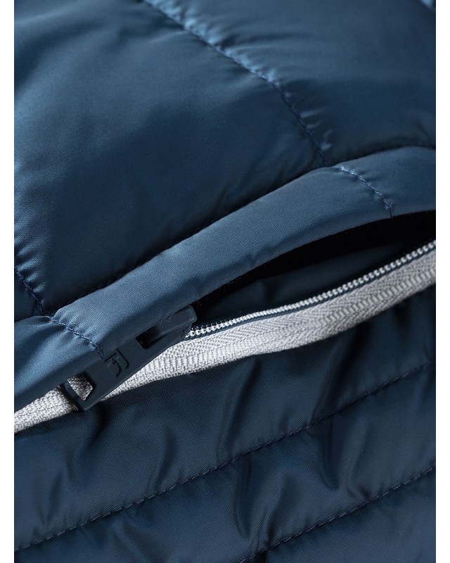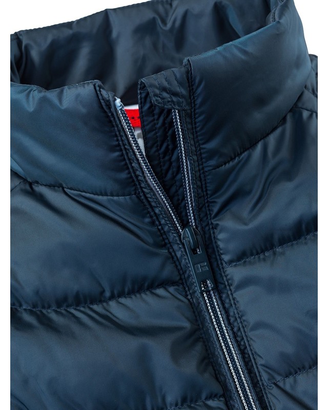 100% poliestere. Tessuto DWR ad alte prestazioni trattato con Aquapel di Nanotex senza fluoro e PFC . Gilet con imbottitura Dupont Sorona. Collo alto con protezione per il mento e pattina antivento interna, zip, fodera e dettagli a contrasto. 2 tasche laterali e 1 tasca interna con zip, Orlo regolabile con coulisse. Discreto accesso per decorazioni sul lato interno sinistro del torace.