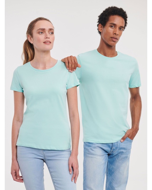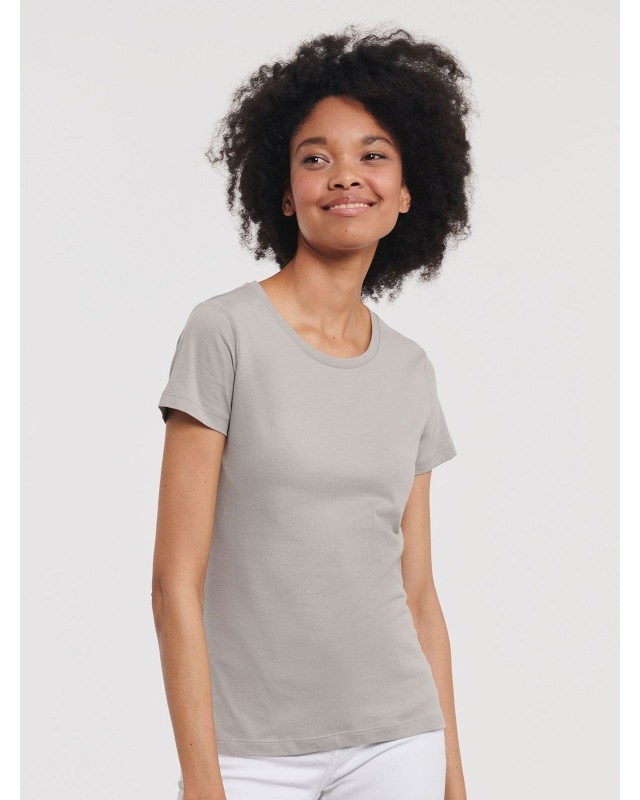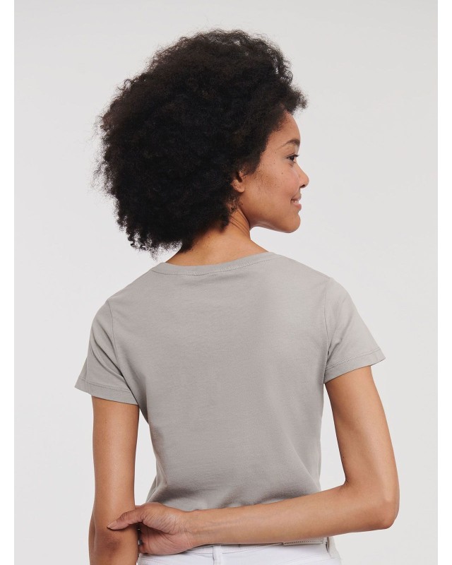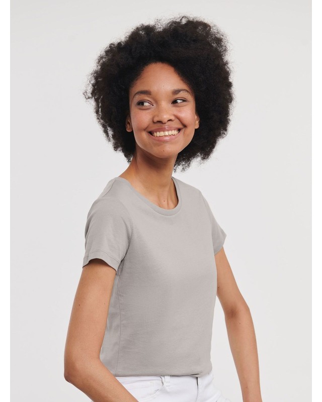 100% Cotone ring-spun organico. T-shirt da donna con nastro di rinforzo spalla-spalla, fascia del colletto in lycra, cuciture laterali, vestibilità sagomata. (Col. LX 97% cot. 3% visc.)