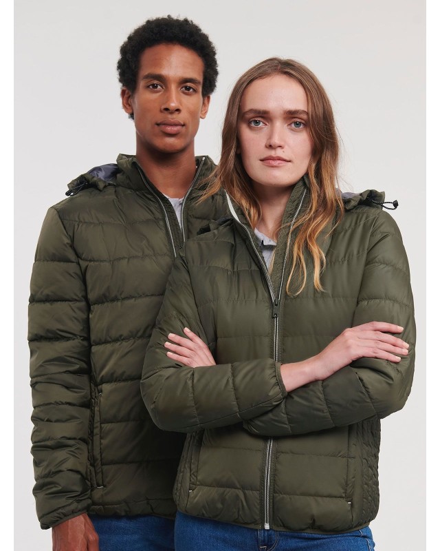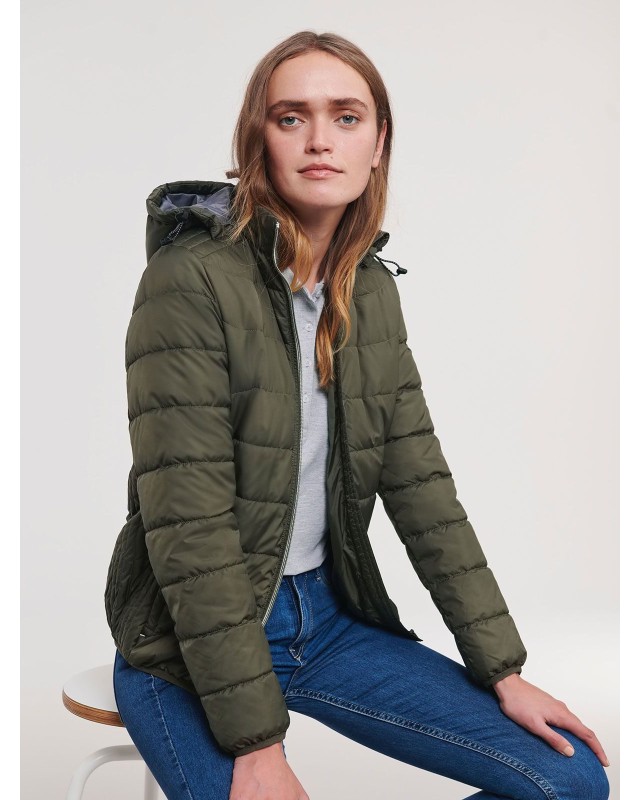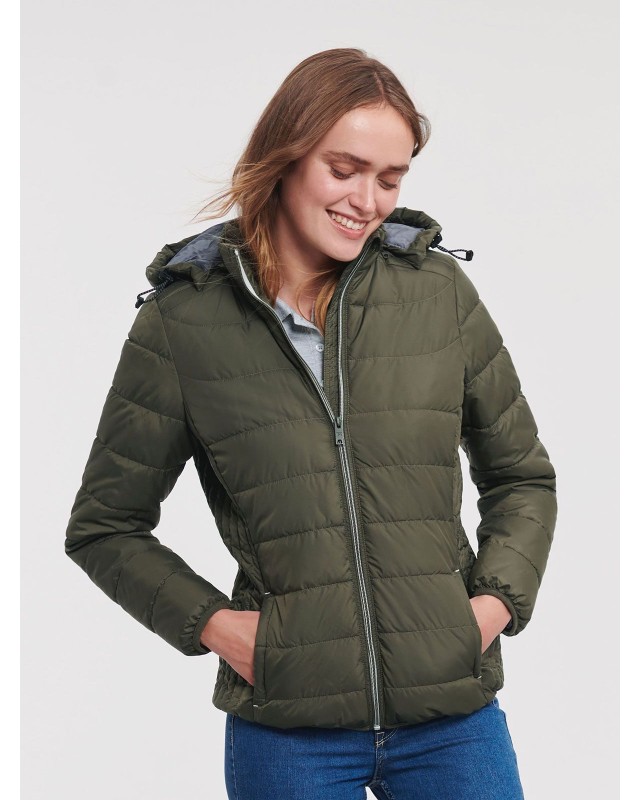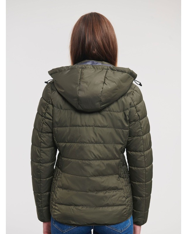 100% poliestere. Tessuto DWR ad alte prestazioni trattato con Aquapel di Nanotex senza fluoro e PFC Giacca da donna con imbottitura ecologica di Dupont Sorona. Collo montante con protezione per il mento e pattina frangivento interna, chiusure zip, fodera e dettagli a contrasto. 2 tasche laterali e 1 tasca interna con zip, cappuccio regolabile e rimovibile. accesso per decorazioni sul lato interno sinistro del torace.