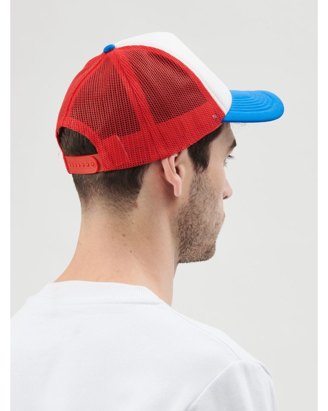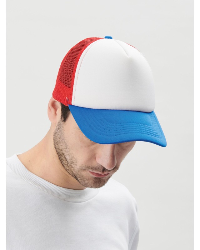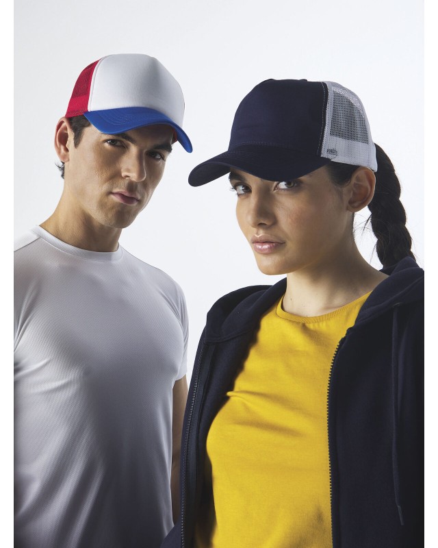 100% poliestere. Cappellino a 5 pannelli con pannello frontale e visiera in poliestere imbottito, pannelli laterali e posteriori in mesh, chiusura con cinturino in pvc, taglia unica.