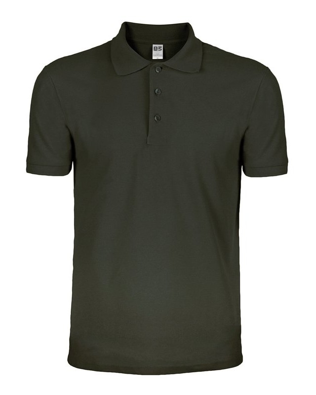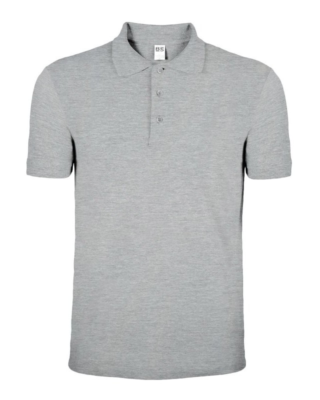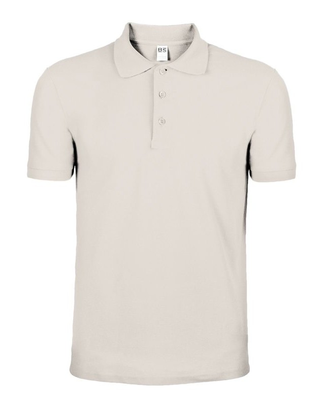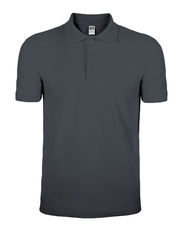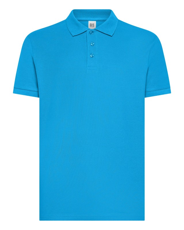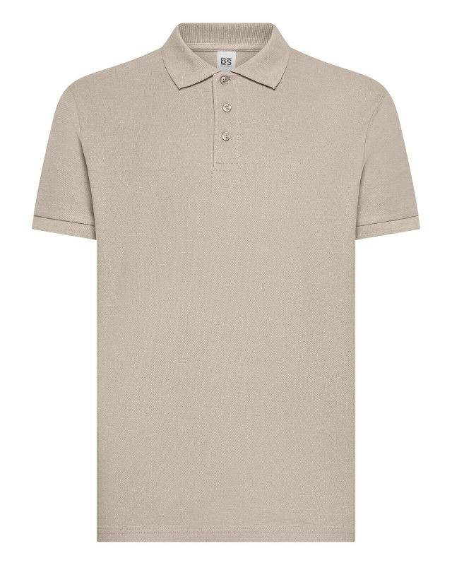 100% cotone piqué. Polo a maniche corte set-in con costine, 3 bottoni tono su tono, nastro di rinforzo al collo, struttura con cuciture e spacchetti laterali. (Col. GY: 85% cot. 15% vis.)