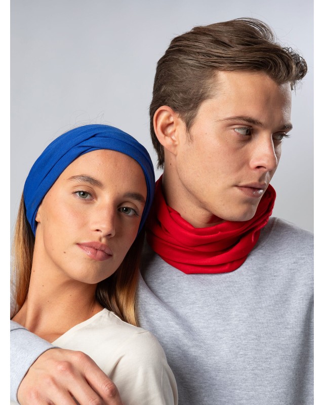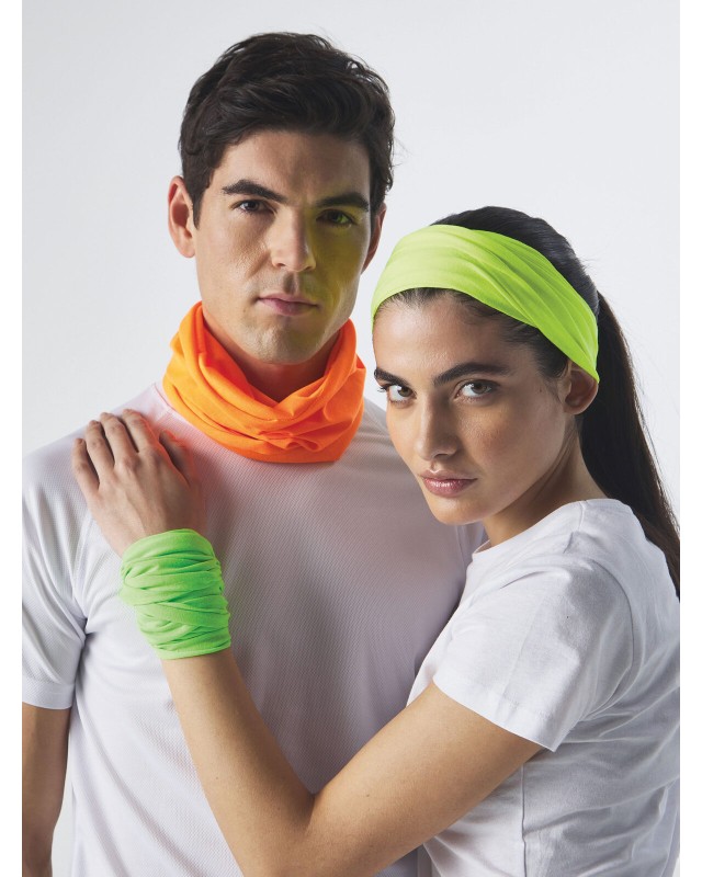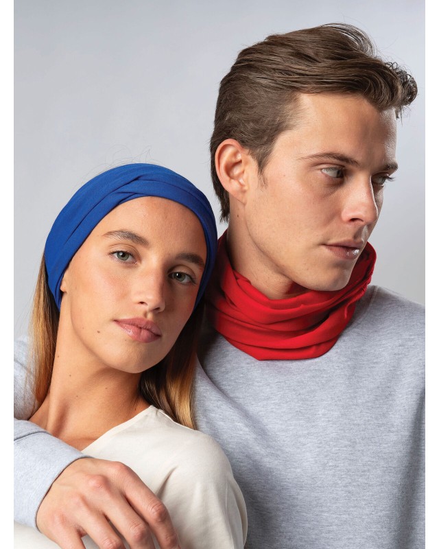100% poliestere. Sciarpa tubulare multifunzione. Dimensioni: 50 x 25 cm. Nessuna etichetta, sticker nella polybag.