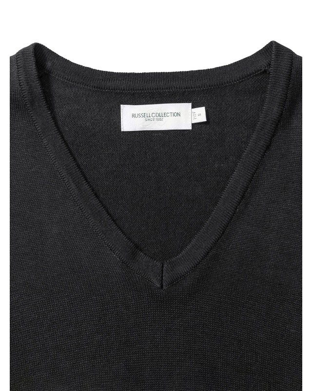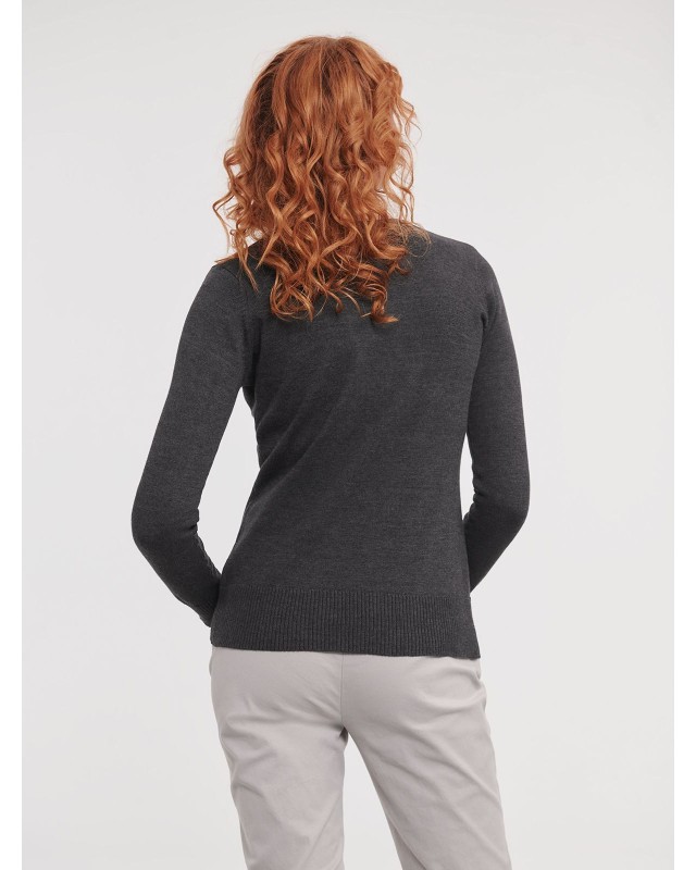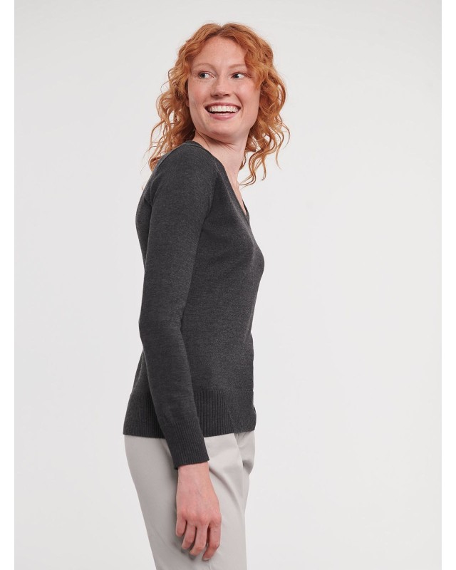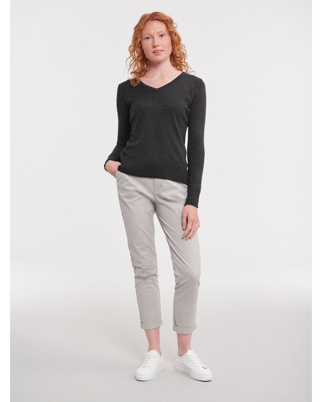 50% cotone, 50% acrilic. Pullover donna con scollo a V, costina 1X1, polsini e girovita con elastane, maniche a giro, lavabile a 40 gradiC. Cuciture laterali.