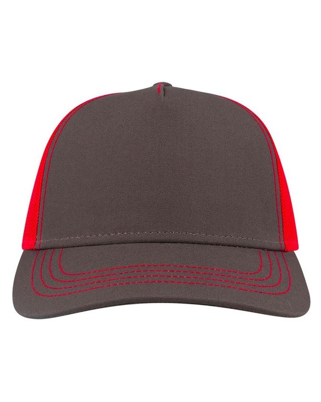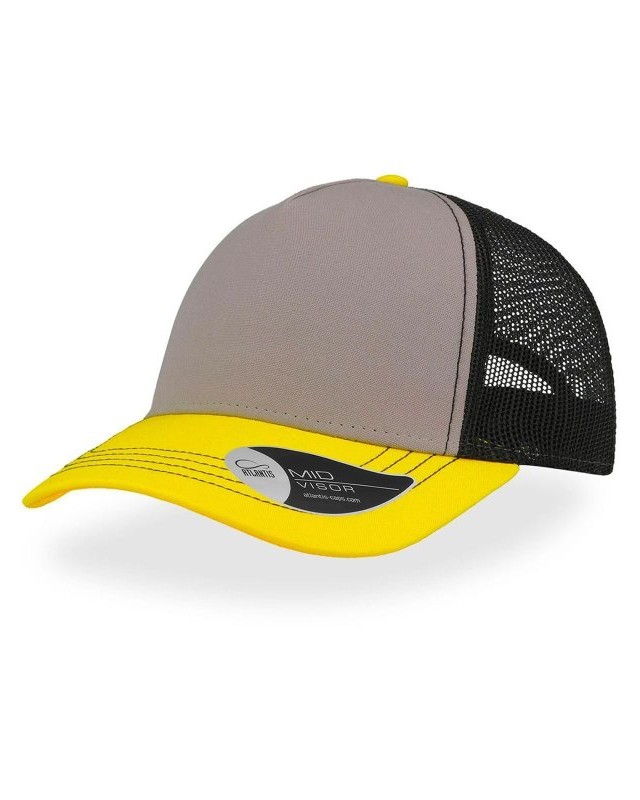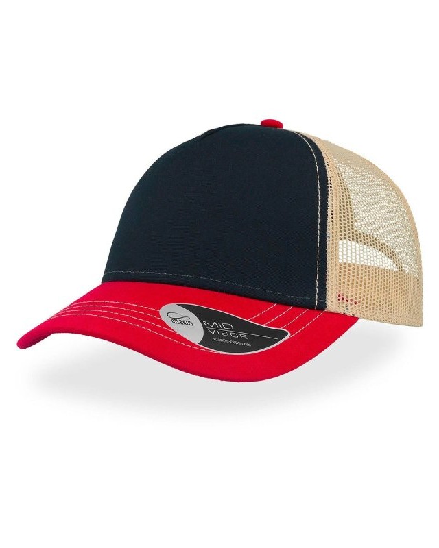 100% Cotone Canvas. Cappellino a 5 pannelli dai colori vivaci, visiera precurvata, mesh posteriore, 4 cuciture sulla visiera, chiusura in PVC.