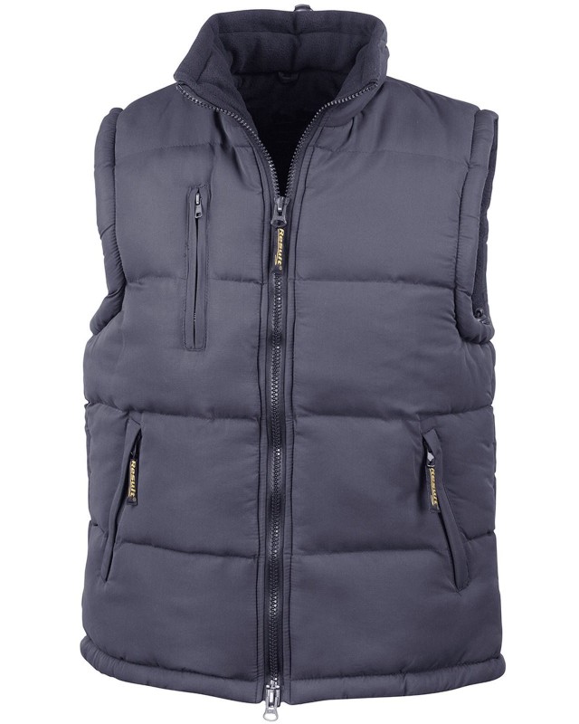 100% Poliestere. Gilet smanicato antivento e resistente all'�acqua cappuccio a scomparsa nel collo, zip frontale completa, 2 tasche frontali, 1 taschino al petto, cappuccio, collo, giromanica e orlo regolabili.