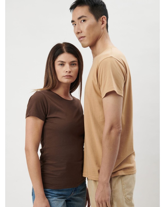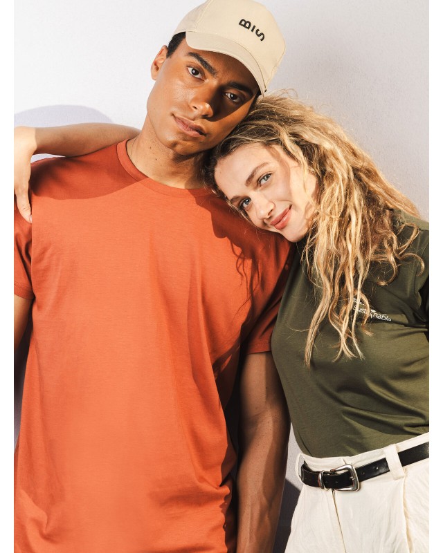 100% cotone organico ring-spun, single jersey. T-shirt manica corta, girocollo con nastro di rinforzo e morbida bordatura, senza etichetta, solo una piccola etichetta taglia, struttura con cuciture laterali. Col. GY: 85% cot. 15% visc.